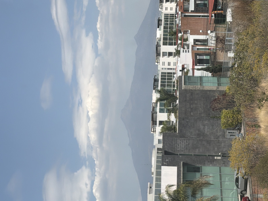 The image displays an urban landscape in San Andrés Cholula, Mexico, under bright daylight with a partly cloudy blue sky
