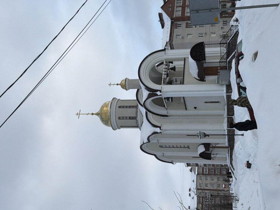 This image depicts a snowy urban landscape in Radkevshchina, Russia, under an overcast sky. The central focus is a white Orthodox church featuring multiple golden onion domes topped with Orthodox crosses. Snow blankets the church's architectural ledges and roofs. To the immediate right of the main dome, a smaller, golden-domed structure is visible. The church's facade includes arched entrances and a bell tower housing visible bells. In the foreground, two individuals are present amidst deep snowdrifts. One person, dressed in dark clothing, stands facing left, partially obscured by snow. Adjacent to them, another person wearing camouflage-patterned attire is partially visible, facing away from the viewer, near a snow-covered red vehicle that is largely buried in the snow. A dark lamppost is situated to the left of these individuals. In the background, multiple-story residential buildings are visible on both sides of the church. To the far right, a gray signpost is partially obscured by the snow. Overhead, two parallel utility lines traverse the upper right portion of the frame. The ground is uniformly covered in significant accumulation of snow.