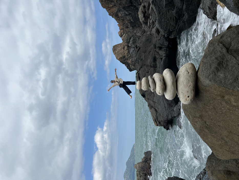 A man standing on a stack of white stones balanced on a rocky cliff with his arms outstretched toward a blue sky with white clouds. He is wearing a light-colored shirt and dark pants. Behind him, there is a dark rocky cliff, and below, the ocean waves crash against the rocks. Mountains can be seen in the distance.
