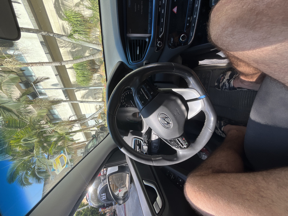 The image depicts a driver's perspective from within a Hyundai vehicle on a sunny day in an urban area of Rishon LeZion, Israel. In the foreground, the bare, hairy thighs and legs of the driver are visible, wearing patterned black and white slides. The vehicle's black steering wheel, featuring a central Hyundai logo and "AIRBAG" inscription, is prominent. To the right of the steering wheel, the dashboard includes an infotainment screen displaying "AUTO:P" and partial text, possibly song titles such as "Neighbours," "Chloe," and "4 Your Eyes Only." Below this, climate controls and a red triangular hazard light button are visible. The driver's side door panel, equipped with window controls and a silver door handle, is on the left. Beyond the windshield, a row of tall palm trees with green fronds and slender trunks lines a street or plaza. Behind these trees, a modern, light-colored multi-story building with multiple windows and prominent vertical architectural elements stands under bright sunlight, which casts distinct shadows from the trees onto its facade. Through the left side mirror and partially through the windshield, a dark-colored SUV or pickup truck, equipped with a spare tire mounted on its tailgate, is visible. A yellow, unreadable sticker is affixed to the upper left portion of the vehicle's windshield.