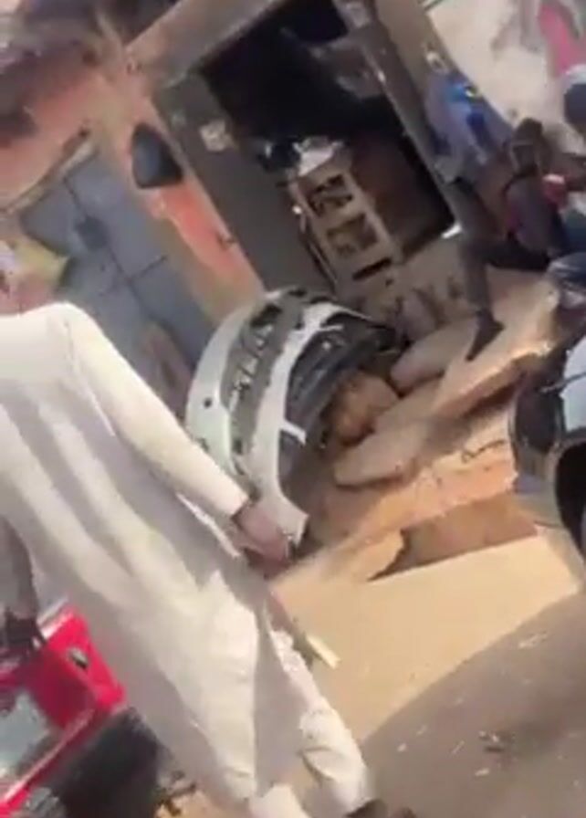 red car in a busy street scene. The car appears old and slightly dusty. Several men wearing traditional Muslim caps approach the car, and one gets into the driver's seat. There are other people visible in the background, including children. The buildings behind the car look like small shops or residences. The scene suggests a street in a crowded urban area.