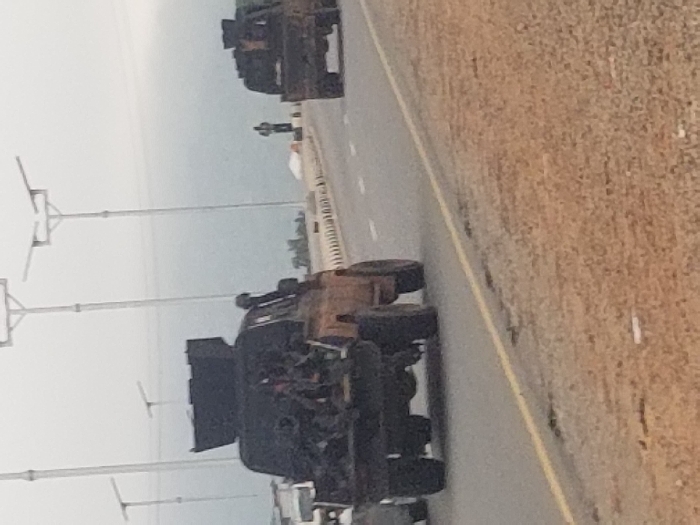 The image displays a daytime scene on a paved highway in Zango-ndaji, Nigeria, under an overcast, light gray sky
