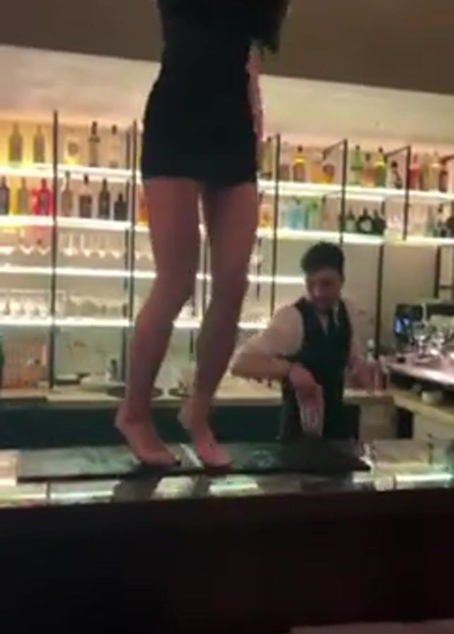 A woman in a short black dress dances barefoot on a bar top. The bar is behind her, stocked with bottles and glasses. Two bartenders are visible behind the bar, one working and the other watching the woman. The lighting is warm and intimate.