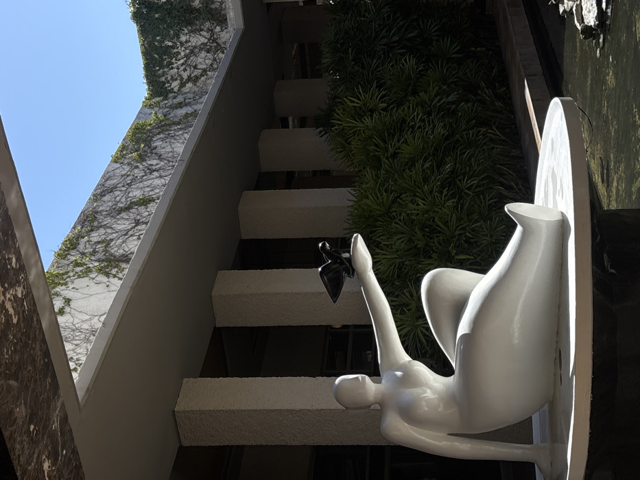 The scene is an outdoor architectural space in Playa del Carmen, Mexico. A large, smooth, white, abstract sculpture of a reclining female figure is prominently displayed in the foreground, seated on a circular white base. The figure's left arm extends horizontally, supporting a small, dark, stylized bird sculpture in its open palm. The sculpture's base is situated in a shallow, dark body of water, with several rocks visible on the right side. Behind the sculpture, a dense mass of green, leafy plants forms a natural backdrop. Further into the background, a series of light-colored, textured rectangular columns support a grey ceiling overhang. Above this structure, a concrete wall is heavily covered with green climbing vines, and a section of clear blue sky is visible through an opening in the overhead structure. The area is brightly illuminated by sunlight, casting distinct shadows.