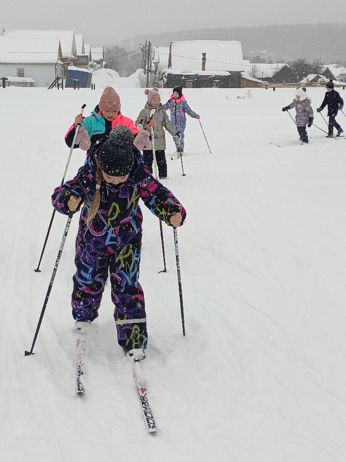 The image displays a winter outdoor scene in Sarapul, Russia, characterized by an overcast sky and visible light snowfall. Six individuals, appearing to be children, are engaged in cross-country skiing across a snow-covered open field. In the foreground, a young female skier, wearing a black knitted beanie with a pom-pom and a vibrant, multicolored (black, purple, pink, blue, yellow) patterned snowsuit, propels herself forward with two ski poles. The right pole bears the visible inscription "SABL". Her skis are marked "RHODOS". Snowflakes are discernible on her clothing and the snow surface. Behind her, positioned from left to right across the mid-ground, are five other individuals, all similarly equipped with skis and poles. These individuals wear various winter garments, including beanies (one pink, one beige with ear-like features, one pink and black, one white with panda-like ears, and one dark), winter jackets, and snowsuits, indicating cold weather. They appear to be moving in a sequential manner or as a group. The background reveals a series of snow-covered residential buildings, primarily single-story structures with pitched roofs, some featuring visible chimneys. Utility poles and associated wiring are also present further in the distance, partially obscured by the weather conditions. The entire ground plane is covered with an unbroken layer of white snow.