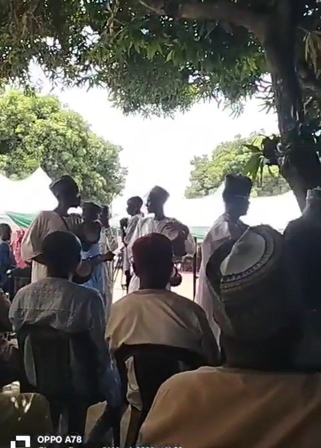 group of people gathered under a tree, apparently for a celebration or event. Several men in traditional clothing are standing and playing musical instruments, while others are seated in chairs watching the performance. There are white tents visible in the background. A camera is being used to record the event. The environment is green, with trees and foliage visible.