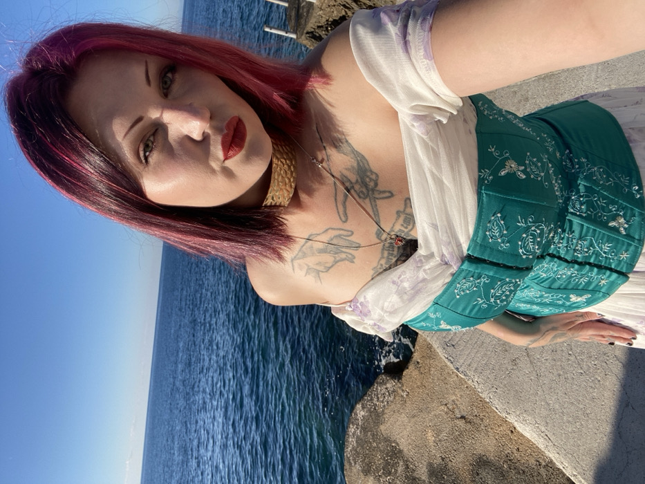This image depicts a female individual in Kunje, Montenegro, positioned outdoors by a body of water under clear blue skies. The subject is situated slightly right of center, facing the camera. She has shoulder-length hair with prominent fuchsia and darker tones. Her face displays visible makeup, including red lipstick and defined eyebrows. Tattoos, including a design featuring a pair of hands, are visible on her upper chest, with additional tattoo patterns on her right arm. She wears a wide, textured gold-toned choker necklace and a thin silver-colored chain with a small red pendant. Her attire consists of an off-white, sheer, off-the-shoulder top with subtle light purple floral patterns, overlaid by a teal corset embroidered with white floral and butterfly motifs. White fabric, likely a skirt, is visible below the corset. The background features a large expanse of blue water with visible ripples, meeting a clear blue sky at the horizon. A concrete or stone pathway runs along the left foreground, adjacent to rocks at the water's edge. On the far right, two light-colored posts extend from a dark, rocky structure near the water. The scene is illuminated by bright daylight.