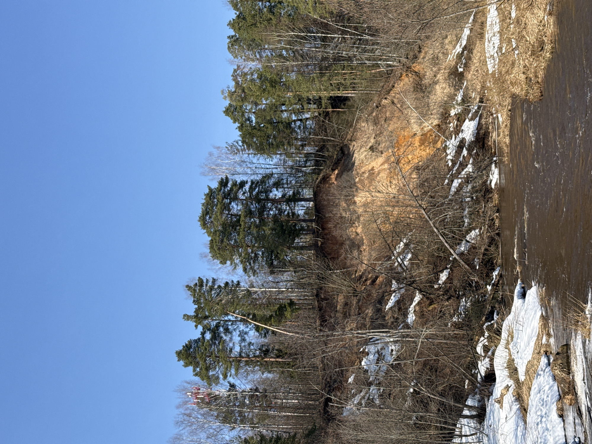 The image displays a natural landscape in Demino, Russia, under a clear blue sky. A brownish river occupies the lower portion of the frame, flowing from the foreground towards the right. Patches of snow and dried, straw-colored vegetation are present along the riverbanks. Rising steeply from the river is an eroded hill, characterized by exposed reddish-brown earth and scattered residual snow patches on its lower slopes. The hill and horizon are densely populated with a mixed forest, predominantly comprising tall evergreen coniferous trees (pines) and numerous bare deciduous trees, including some white-barked birches. A tall, slender telecommunications tower, white with red horizontal stripes, is partially visible on the far left, situated behind the treeline on the hillside. No human figures or active subjects are present in the scene.