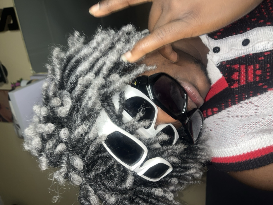 An individual with gray-toned, curly, loc-like hair wears two pairs of sunglasses. One pair has a black frame, while the other has a white frame. The person is wearing a white top with red and black patterns. The individual holds their hand near their forehead. The image is rotated to the side.