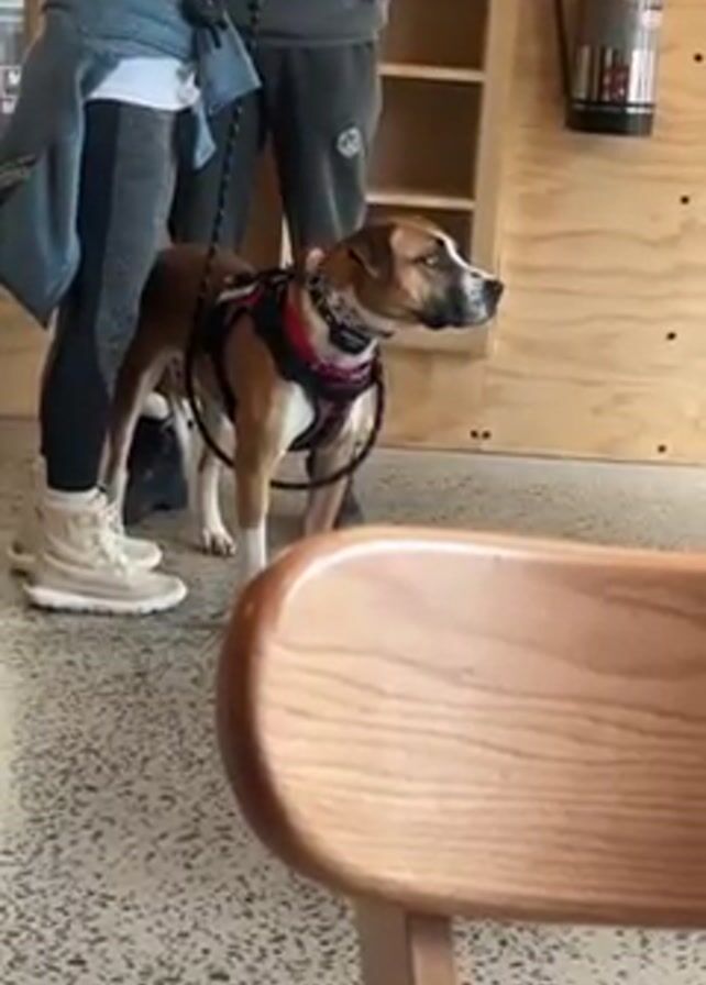 The scene is indoors, possibly in a café or shop, as indicated by a wooden chair in the foreground and a shelf unit and fire extinguisher visible against the wall. The floor appears to be speckled. A medium-sized brown and white dog stands with its owners, who are partially visible to its left and behind it. The dog is wearing a red and black harness and leash. The focus is on the dog, which is looking to the right side of the frame with a focused expression. A high-pitched, whistling sound is audible during the recording, possibly from an alarm.