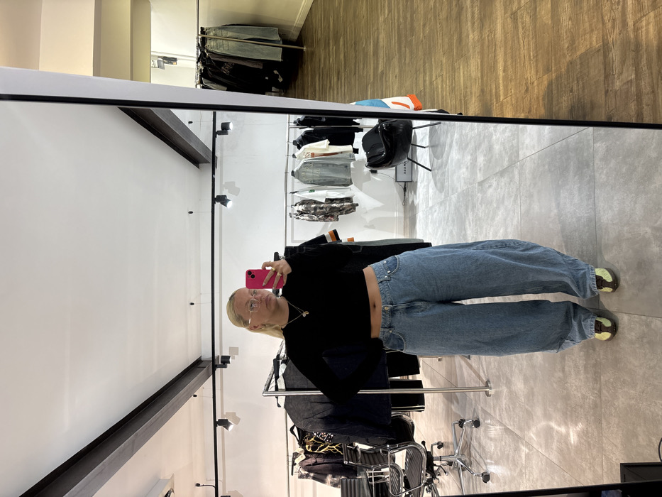 The scene depicts a young Caucasian female taking a mirror selfie inside a retail clothing store in London, United Kingdom. She stands centered, facing a large, full-length mirror. Her blonde hair is pulled back, and she wears clear-framed glasses, a gold necklace with a cross pendant, a black long-sleeved cropped top, light blue wide-leg jeans, and lime green and brown sneakers. She holds a hot pink smartphone in her right hand, aimed at her reflection, while her left hand rests on her left hip. The store features light grey tiled flooring, a white ceiling with dark exposed structural beams, and multiple black track lighting fixtures. In the background, clothing racks display various garments, including denim and jackets. A black ergonomic office chair is visible on the left, and a black modern lounge chair is on the right. A white box-shaped sign, partially visible behind the lounge chair, appears to read "BOXMADE." An additional retail area with more clothing racks is discernible through an open doorway further back. The specific street or borough in London is not identifiable from the image.