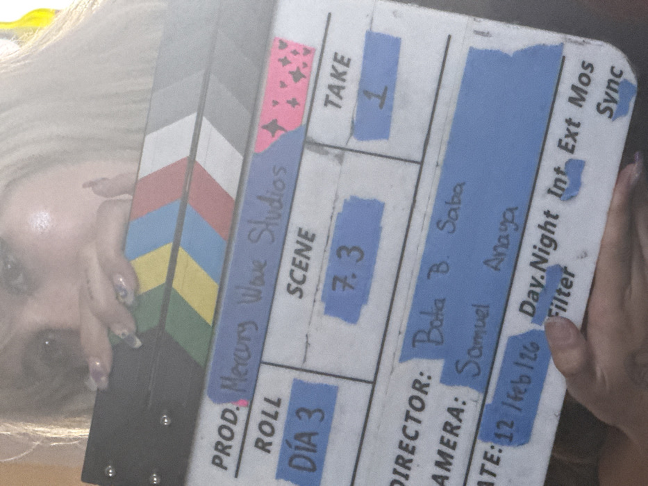 A film slate is held, indicating the production company as "Mercury Wove Studios." The roll is "DÍA 3," the scene is "7.3," and the take is "1." The director is listed as "Bata B. Saba," and the camera operator is "Samuel Anaya." The date is "12 / Feb / 26," and information about the day/night, interior/exterior, filter, and sync is either obscured or yet to be filled in.