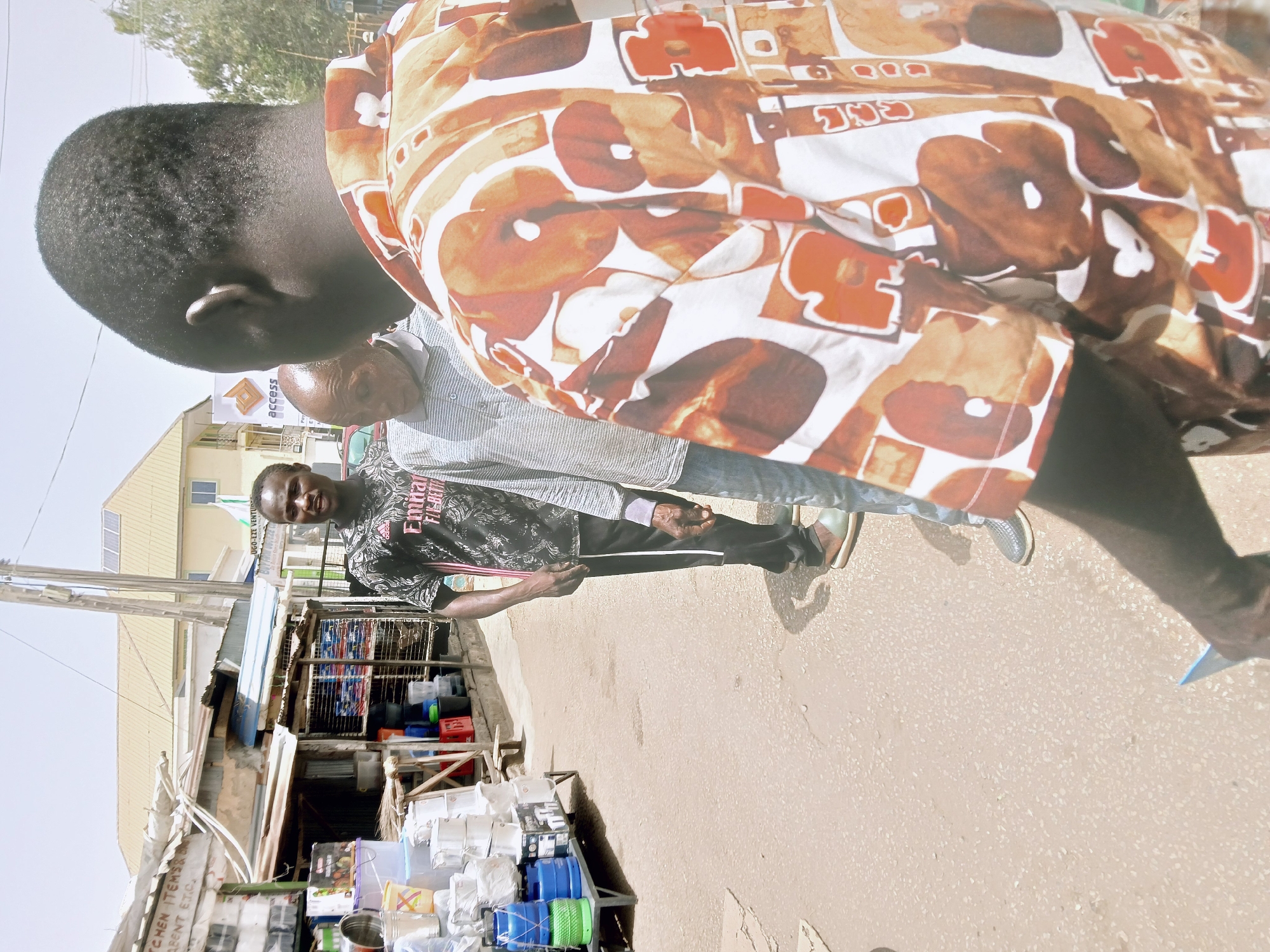This image depicts an outdoor commercial street scene in Kitwe, Zambia, under bright daylight. Three adult males are present on a light-colored, paved ground surface. In the immediate foreground, a male individual is seen from behind, wearing a short-sleeved collared shirt patterned with abstract brown, orange, and white shapes. A partial view of his left arm and hand is visible at the bottom right, holding a small blue, pointed object. In the mid-ground, to the left of the foreground individual, an older male with a bald head is positioned, facing partially left. He wears a light-colored, possibly striped, collared shirt and blue jeans. His left hand hangs at his side. To the left of the older male, a younger male stands facing the camera, with a slight open-mouthed expression. He wears a dark, short-sleeved t-shirt with "Emirates Fly Better" and an Adidas logo printed on it, dark pants, and light green sandals. To the far left of the men, a series of market stalls are visible. These structures are constructed from corrugated metal sheets, wood, and tarps. One stall displays a sign partially reading "KITCHEN ITEMS & HABENT E.T.C." Various household goods, including stacks of white and blue plastic containers, metal pots, and other items, are displayed on tables and shelves. In the background, beyond the stalls, a two-story building with a light-colored facade and a tan gabled roof is visible; solar panels are mounted on its roof. Further right, another building features a large white sign with the word "ACCESS" and a logo, and a green, white, and red flag is partially visible. A wooden utility pole runs vertically up the right side of the frame. The sky is clear and bright.