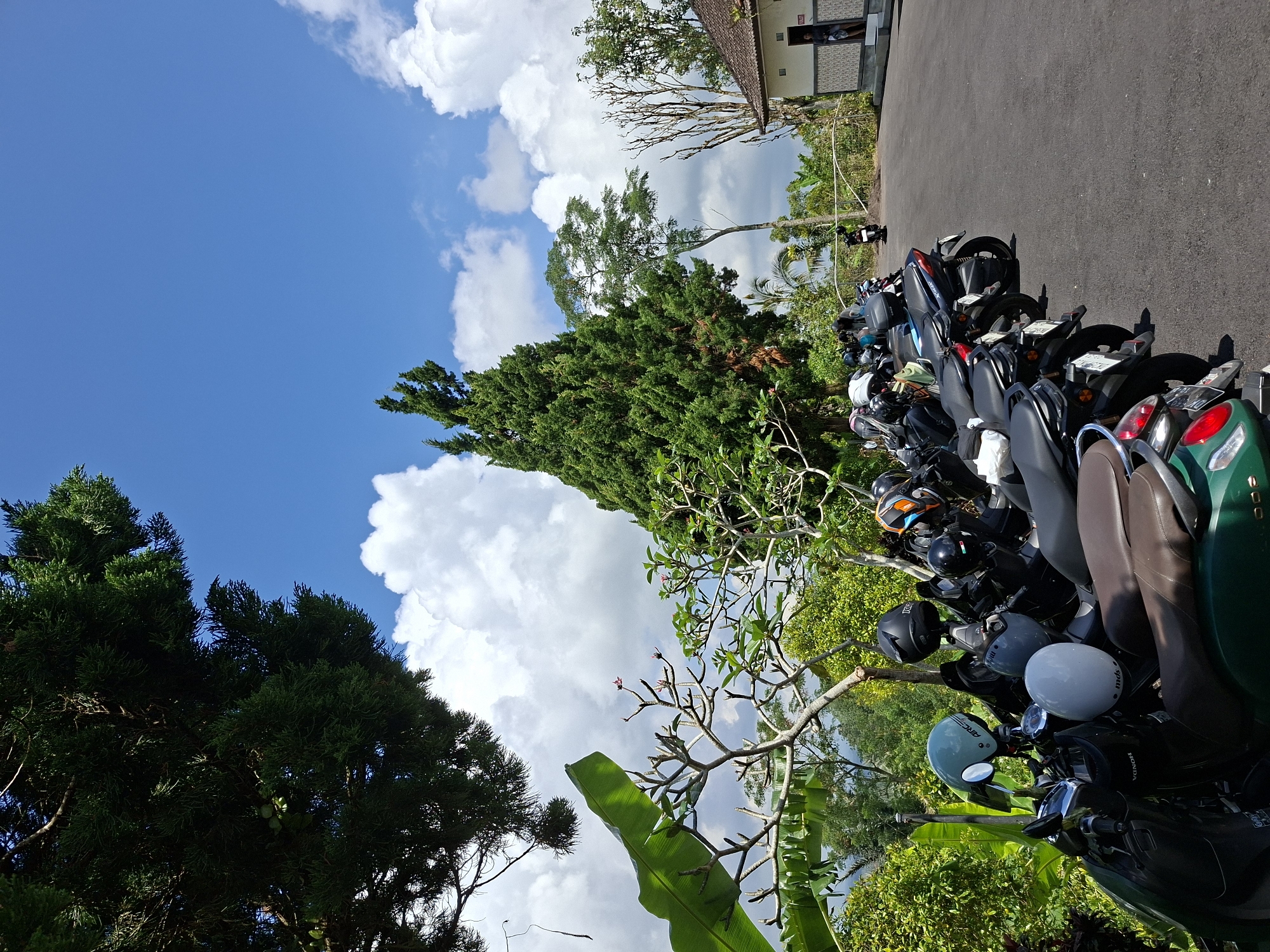 The image depicts a parking area in Petang, Indonesia, filled with parked motorcycles. The motorcycles vary in color and style, with some helmets placed on their seats. The parking area is adjacent to a paved road. Beyond the motorcycles, lush green trees and plants fill the background, and a building with a tiled roof is visible in the distance. The sky above is blue with scattered white clouds.