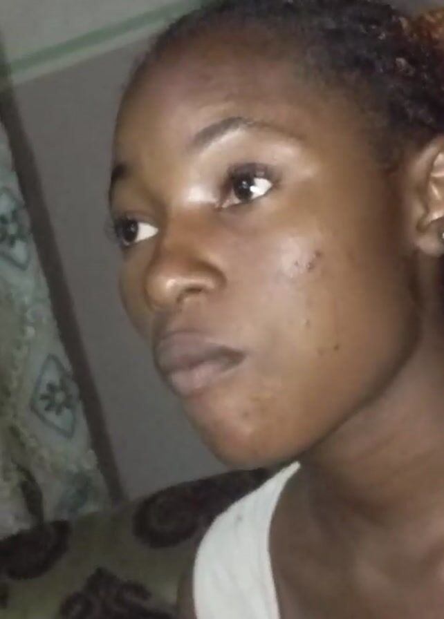 A close-up shot shows a young woman with dark skin, facing slightly away from the camera