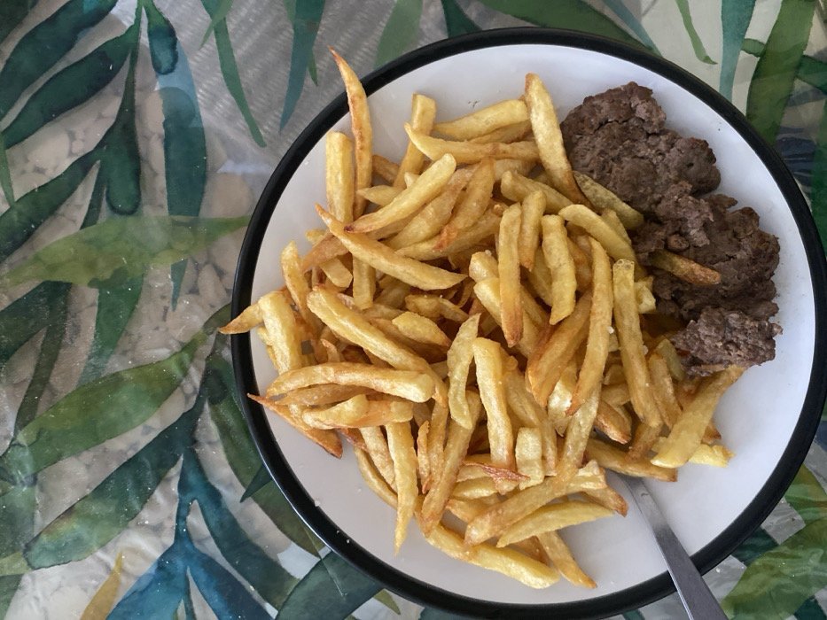 The image displays a meal served on a white plate with a black rim. The plate contains a substantial portion of golden-brown french fries occupying most of its area. To the bottom right, three irregular clumps of cooked ground meat, brown in color, are visible, partially obscured by the fries. A silver-colored fork handle is positioned at the bottom left, extending beneath the fries on the plate. The plate rests on a surface covered with a patterned tablecloth or placemat featuring large green and teal leaf motifs against a lighter, textured background. The scene is located in Capesterre-Belle-Eau, France. No individuals or active interactions are depicted.