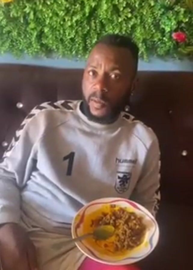 A man is sitting on a brown couch with a decorative wall hanging of foliage and flowers behind him. He is wearing a gray sweater with the number 1 on it, along with a Hummel logo and white shorts with red underneath. In his left hand, he holds a white plate containing a yellow liquid dish with small, dark pieces. He holds a spoon in the plate, facing up. He looks at the plate, then to his right, then back at the plate and down. The lighting is bright.