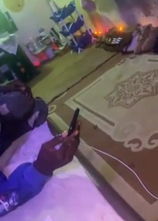 A person lies on a white-covered surface and looks at a smartphone. The person is wearing a blue long-sleeve shirt and grey sneakers. The room is illuminated with green, red, and orange lights. A brown, cream and green patterned rug is in the center of the room. Various shoes and sandals are arranged on the floor near a blue shoe rack. Some decorative items are on shelves.