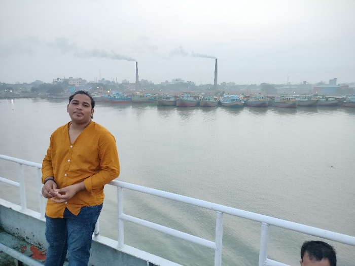 A man in a mustard yellow collared shirt and blue jeans stands on the deck of a boat, looking towards a row of docked boats, holding his left hand to his chin with his right hand on his abdomen. His shirt is untucked. He is wearing a silver watch on his left wrist. The boats are docked on the edge of a river with a factory in the background. The river is calm and smooth, and there is a light fog or haze in the air. The location is Munshiganj, Bangladesh, at coordinates (latitude: 23.564, longitude: 90.526). The factory has two tall smoke stacks that are emitting plumes of smoke. The boat's railing is white with a grey base. There is a glimpse of another person, obscured by shadow, standing on the deck to the right of the man, facing away from the camera. The view of the factory and boats is across the river. The sky is a light grey.