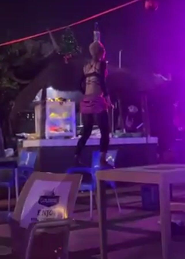 At night, a person with short blonde hair is dancing on two blue chairs, while balancing a bottle on their head. They are wearing a pink fringed skirt and a black top with lacing across the back. The chairs are on a patio or stage with a thatched-roof structure behind them. A display case with colorful items is to the left of the structure. There are tables and chairs in the foreground, and string lights and Christmas ornaments are visible above. The lighting shifts between purple, blue, and green.