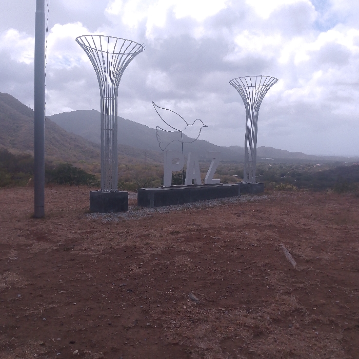 The scene depicts a monument situated on an elevated, barren landscape in Tacarigua, Venezuela. The foreground consists of reddish-brown, dry soil with sparse vegetation. A grey utility pole is partially visible on the far left. The central monument features two tall, silver-colored, inverted conical structures composed of parallel metal rods. Positioned between these structures is a sign spelling "PAZ" in large white block letters, resting on a dark base, with a white outline of a dove in flight positioned above it. The background displays rolling hills and mountains covered in dry vegetation, with a distant view of a lower-lying area containing scattered greenery and structures. The sky is overcast with grey clouds. No human subjects, actions, or interactions are present.