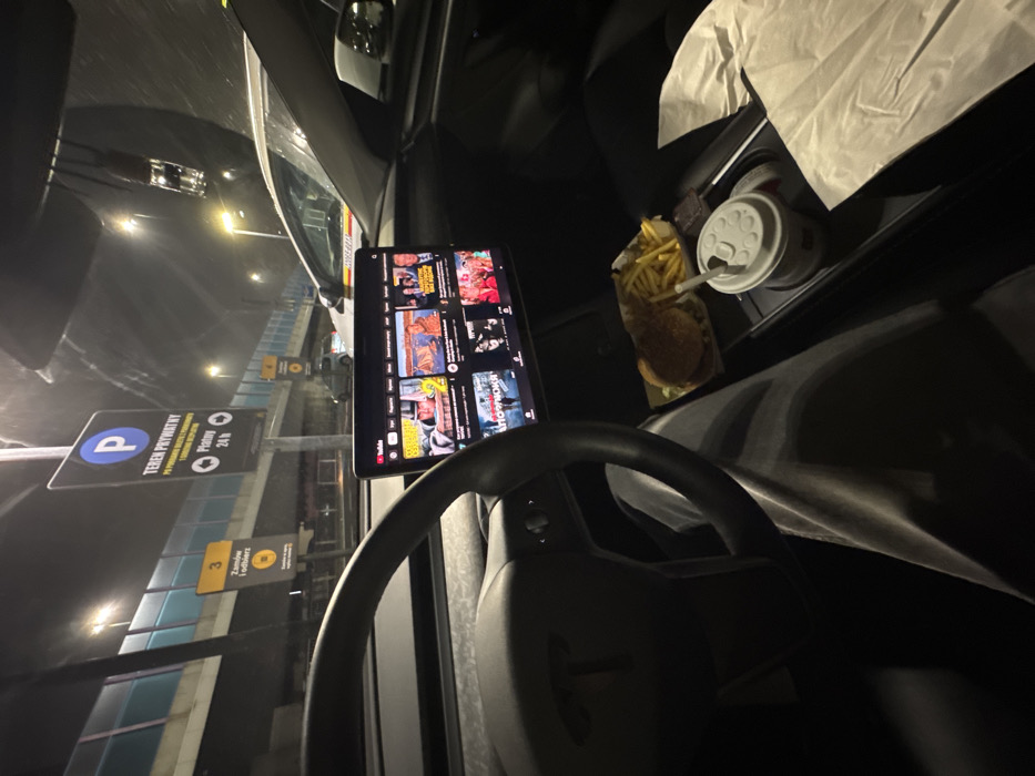 Inside a Tesla, a steering wheel bearing the Tesla logo is prominent. A tablet displaying YouTube thumbnails is mounted on the dashboard. Fast food items—fries, a burger, and a drink—sit on the center console. Outside, streetlights illuminate a parking area with signs indicating "Teren Prywatny" and "Płatny 24h". The scene appears to be captured at night, with limited ambient light inside the vehicle.
