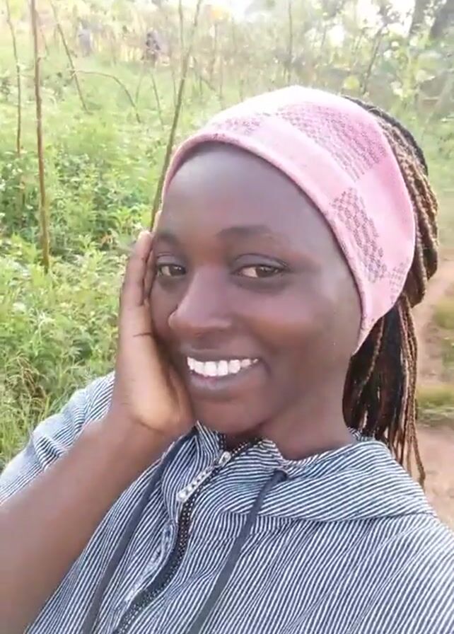 A person with brown skin and braided hair, wearing a pink headband and a gray and white striped hooded shirt, smiles and touches their face while recording a selfie video outside. The person is standing on a dirt path with greenery and trees in the background.