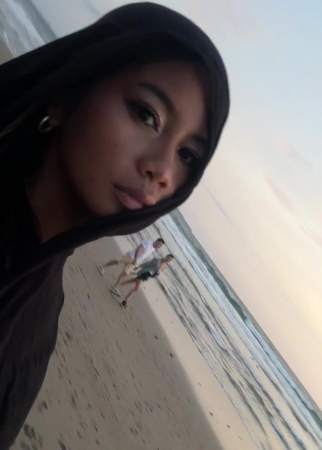 - "The video depicts a person with dark hair wrapped in a dark scarf or hoodie, possibly of Asian descent, looking at the camera on a beach" by FM-dya8j2, licensed under CC BY 4.0