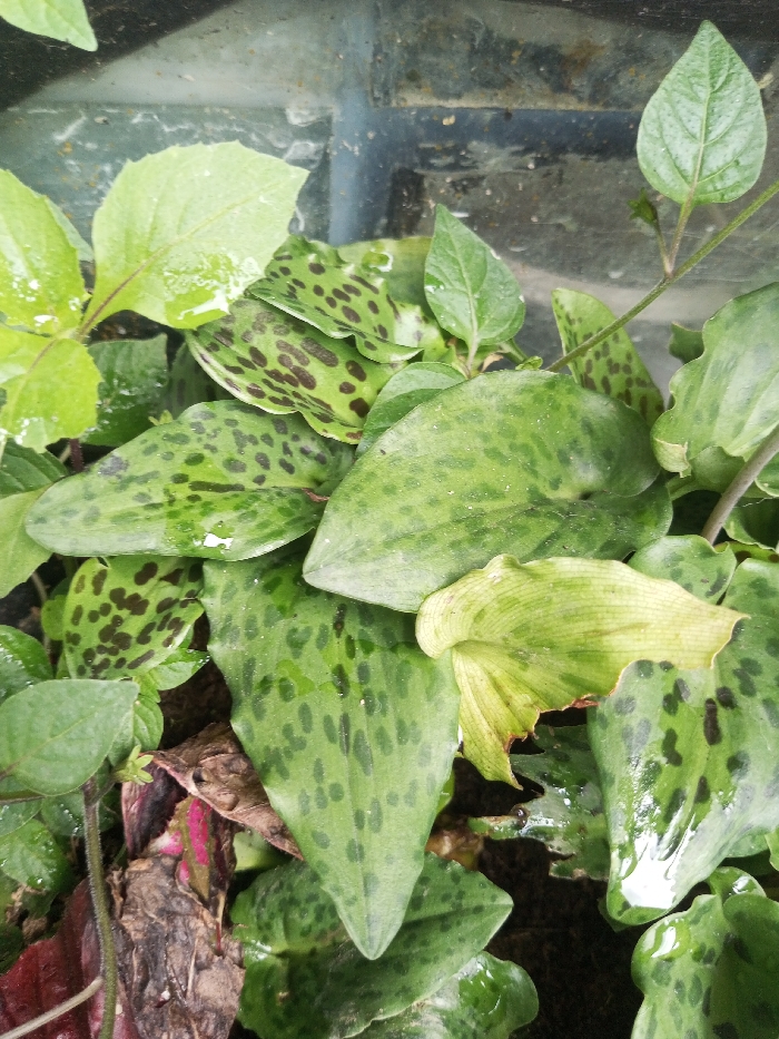 The image displays a close-up, overhead perspective of dense plant foliage situated in Ciherang, Indonesia. The scene is dominated by numerous green leaves, many featuring distinct dark green to black circular or irregular spotted patterns. Interspersed are lighter green leaves, some smaller and ovate, belonging to different plant species. Several leaves exhibit small water droplets on their surfaces. The plants are rooted in dark, moist soil or substrate, with remnants of brown organic matter visible near the bases. A dark-colored, textured surface, consistent with the interior of a container or planter, is visible in the upper background. No individuals or specific actions are depicted.
