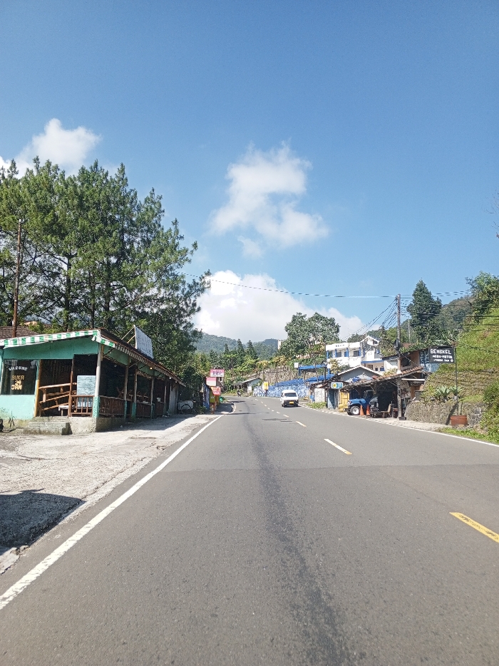 The image displays an asphalt two-lane road traversing a hilly, vegetated landscape under a clear blue sky with scattered white clouds. The time of day is daylight, likely morning or early afternoon. The location is not Multhan, India; signage visible in the scene, specifically "WARUNG BUKA 24 JAM" and "BENGKEL MERE-MOTOR," contains Indonesian text. The road features a solid white line on its left edge and broken yellow lines indicating the center. It appears to ascend gradually and curves slightly to the right in the distance. One white sedan is observed driving uphill in the far distance on the right side of the road. No other vehicles are in motion. On the immediate left, a single-story building with a light turquoise-green facade and a corrugated metal roof features an open-air seating area with wooden railings and benches. A sign on this structure reads "WARUNG BUKA 24 JAM." Tall, coniferous trees stand directly behind this building. Further along the left side of the road, a sign displaying the partial text "REF" is visible. On the right side of the road, a series of structures line the uphill slope, interspersed with stone retaining walls and dense greenery. One building exhibits a blue roof. Another open-front structure further down shelters a dark blue utility vehicle or small tractor. A prominent sign on this side reads "BENGKEL MERE-MOTOR." Utility poles with overhead wires are visible along both sides of the road, particularly on the right. No people are clearly discernible within the frame.