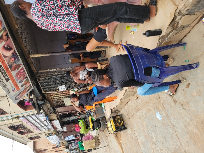 A bustling outdoor market scene showcases several people, possibly customers or vendors, relaxing outside shops. A blue plastic chair is tipped on its side near a woman in jeans. Another woman sits in an orange chair. Nearby, a small generator sits on the ground. Signage for "Hair Network" is visible. The overall image depicts a casual street scene with people at ease.