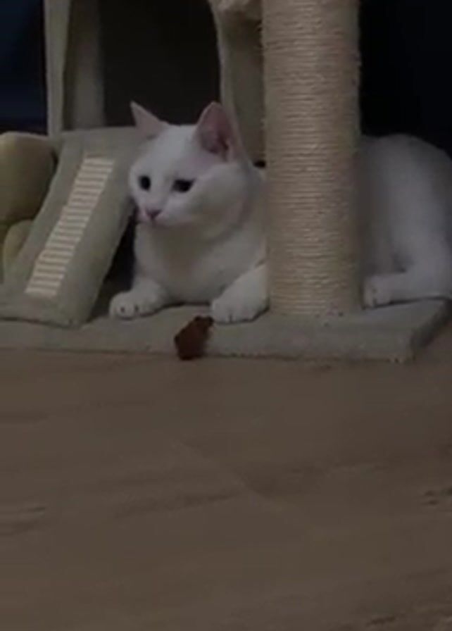 A white cat is lying under a cat tree on a carpeted base. The cat is facing left of frame, and a brown treat or toy sits on the carpet between the cat and the viewer. The cat bats the object with its right paw. The floor is light-colored hardwood. The cat tree is beige.