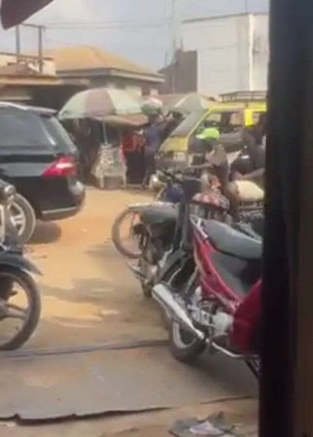 street scene, likely in a city in Africa, with motorbikes, a black SUV, and people walking and riding bikes. The scene is viewed from inside a building with an open doorway. The street appears busy with people and vehicles. Several motorcycles are parked near the doorway, and more bikes and people are seen moving through the street. Street vendors with umbrellas are also visible.