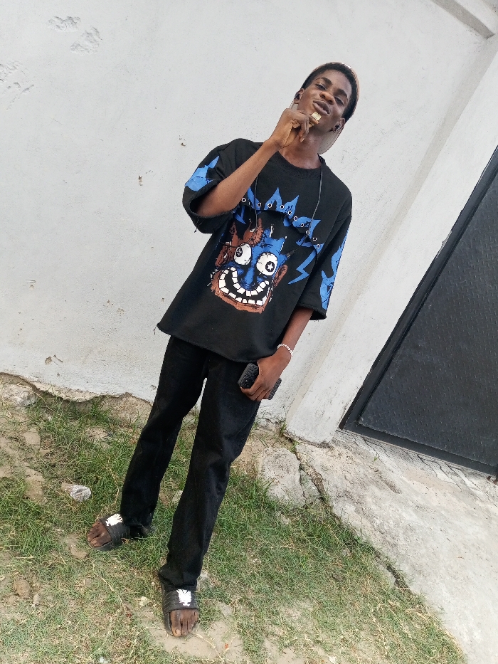 young man standing in front of a white wall and a black door. He is wearing black pants, a black t-shirt with a blue and black graphic design, and white sandals. He is holding a black smartphone in his right hand, and his left hand is raised to his chin. He is looking at the camera. The scene is located in Lekki, Lagos, Nigeria at coordinates (latitude: 6.471, longitude: 3.736). The environment is a residential area with a white concrete wall, a black door, and green grass.