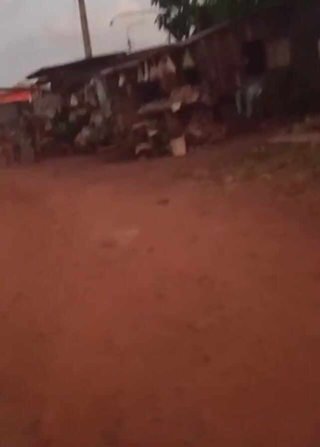 dirt road in what appears to be a developing or underdeveloped area. The road is reddish-brown in color. To the side of the road is a structure that looks like a small shack or shop, appearing to be constructed from mismatched materials. There is clutter around the structure and items hanging from the roof, suggesting it may be used for sales or storage. In the background, there are a few blurred figures that look like children, possibly playing or walking. The sky overhead is overcast and the light suggests it's either early morning or late afternoon. There are utility poles visible in the background.