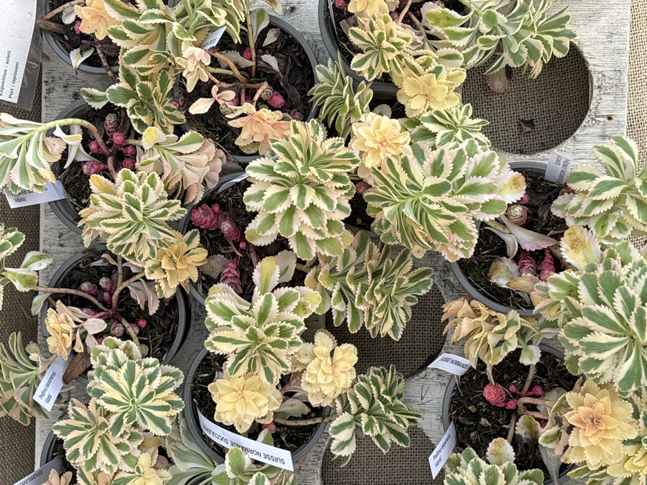 - "An overhead view reveals a densely packed display of numerous small succulent plants in dark gray plastic nursery pots, arranged on a light-colored wooden surface partially covered by a light brown burlap fabric" by FM-2VH5m1, licensed under CC BY 4.0