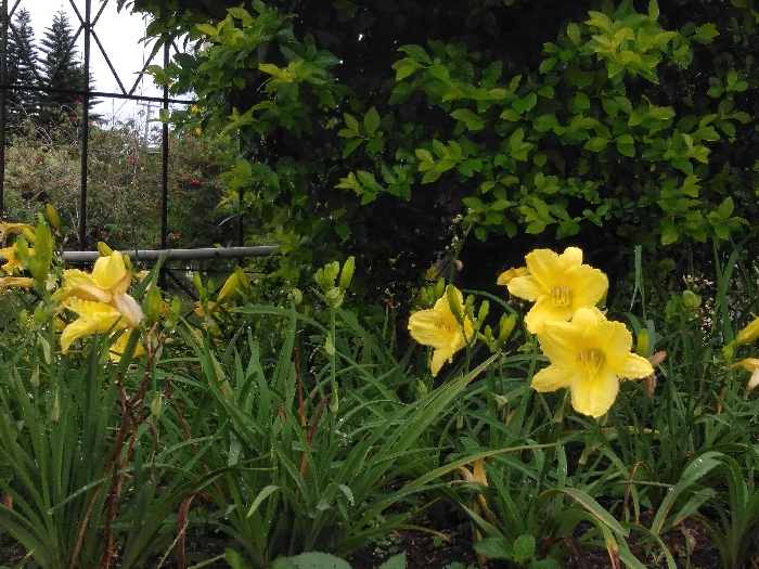 The image displays an outdoor scene in Chan-Nua, Laos, focused on a dense cluster of flowering plants under an overcast sky. The foreground is occupied by multiple bright yellow daylilies (Hemerocallis) in bloom, intermingled with their long, strap-like green leaves. Numerous water droplets are visible on the petals and foliage, indicating recent rain or heavy dew. Many unopened daylily buds are also present. Behind the flowering plants, a dense mass of dark green leafy vegetation forms a natural backdrop. To the left of the frame, a black metal fence with a geometric pattern is partially visible, featuring a horizontal metal pipe or bar running across it. Through the fence, additional distant trees and shrubs with varying shades of green and some reddish foliage are discernible, including a tall conifer on the far left. No human or animal subjects are present, and no specific actions or interactions are depicted.