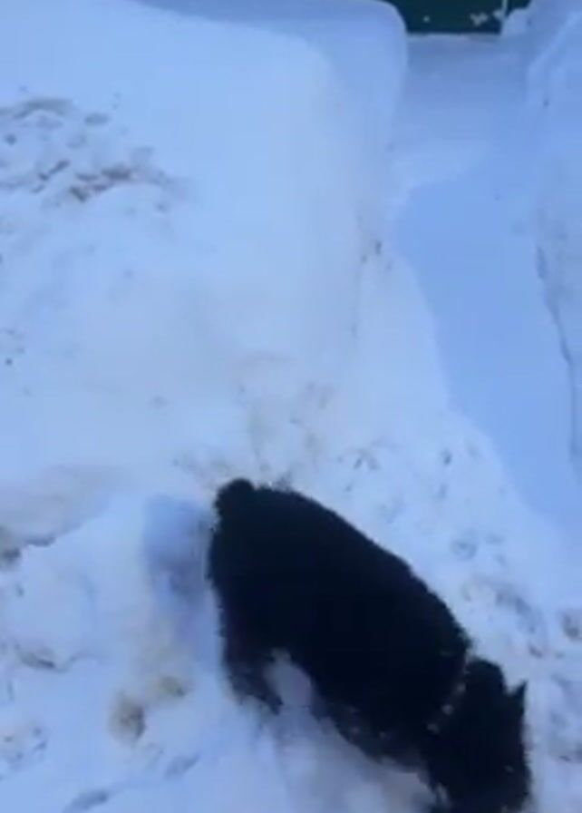 - "A black dog on a leash stands in a snow-covered path, next to a mound of snow, and sniffs and digs in the snow" by FM-wEGNo2, licensed under CC BY 4.0
