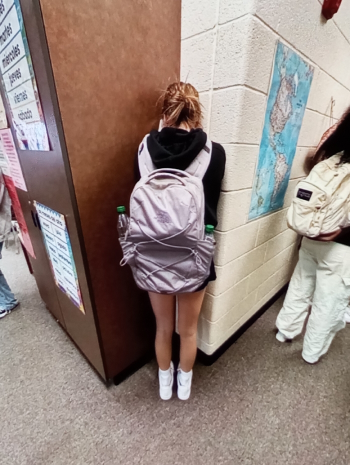 The image displays an indoor scene, likely a hallway or common area within an educational institution. The specific location in Mrozów, Poland, is not discernible from the visual evidence within the image. In the center, a female subject stands with her back partially to the camera, facing a corner formed by a dark brown cabinet-like structure and a cream-colored concrete block wall. She wears a black hooded top and dark shorts or a skirt, with white athletic shoes. Her light-colored hair is gathered in a messy bun. She carries a light purple/grey 'The North Face' backpack, which holds two green-capped plastic water bottles in its side mesh pockets. To the subject's right, the partial back view of another individual is visible, wearing a light cream-colored 'Jansport' backpack, loose-fitting light-colored pants, and white shoes. Long dark hair is visible. To the left of the central subject, only the lower legs and feet of a third individual are visible, clad in blue jeans and white athletic shoes. The cream-colored concrete block wall features a vertically oriented world map, predominantly showing the Americas with blue-tinted water. The dark brown cabinet structure has several papers affixed to its side, including a vertical poster listing Spanish days of the week ('martes', 'miércoles', 'jueves', 'viernes', 'sábado'). The floor is covered with a light brown/tan speckled material. No direct interactions between the individuals are observable.