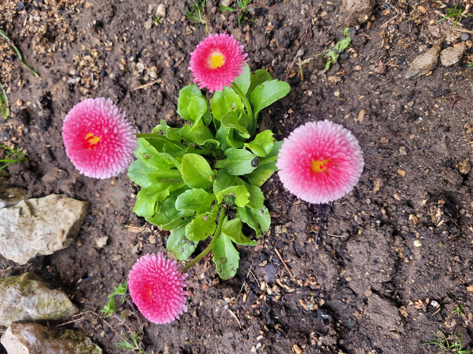 - "A close-up, high-angle shot shows four pink pompon daisies arranged around a central cluster of green leaves" by FM-laGG22, licensed under CC BY 4.0