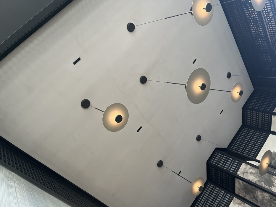 A low-angle view of a white ceiling with multiple disc-shaped light fixtures