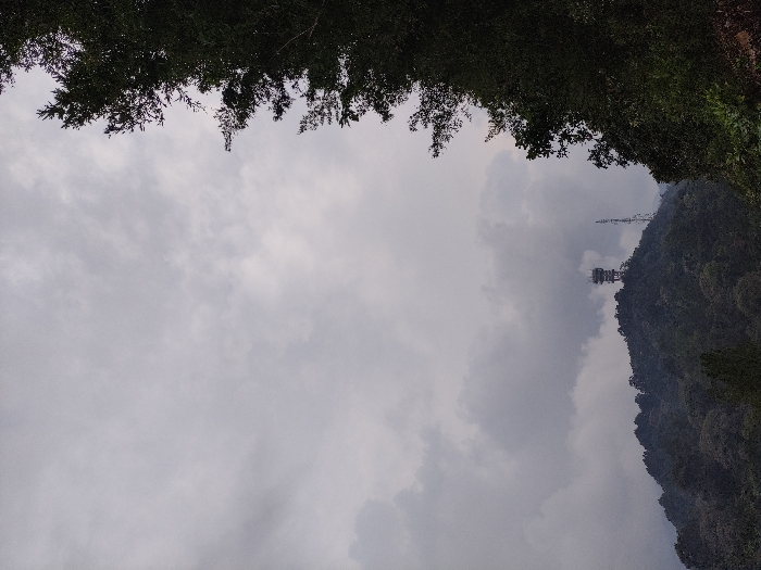 The image displays a panoramic view of a densely forested hill under an overcast sky in Staufenberg, Germany. The upper half to two-thirds of the frame is dominated by a uniform expanse of gray, cloudy sky. On the crest of the central hill, the Staufenberg Tower, a prominent multi-tiered communication or observation tower with a light-colored, possibly concrete or metal structure, stands. To the immediate right and slightly below the main tower, a slender, darker metallic lattice mast is also visible. The foreground along the right edge of the frame is occupied by a dense cluster of dark green tree foliage, partially obscuring the view. The remainder of the hill is covered in continuous, dark green forestation. No individuals, animals, or specific actions are depicted.