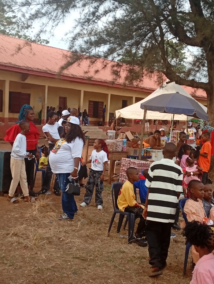 The image depicts an outdoor gathering in Nkwelle, Nigeria, set against a single-story building with a red corrugated metal roof and cream-colored walls, featuring multiple dark window and door openings. A large tree with sparse foliage dominates the overhead space. The ground consists of dry, light-brown earth with sparse grass. In the center-right, a white canopy tent and a blue-and-white striped market umbrella shelter tables displaying packaged snacks and bottled beverages. Approximately 25-35 individuals, predominantly Black adults and children, are present. A woman with blue braided hair in a red top stands on the left, interacting with a child in a white shirt and beige pants. In the mid-foreground, a woman wears a white t-shirt, blue jeans, a white baseball cap, and carries a black woven handbag; she appears to be pregnant. Numerous children are scattered throughout the scene; several are seated on blue plastic chairs. One boy in a yellow long-sleeved shirt sits on a chair in the lower-right, and another boy in a black and white striped t-shirt walks away from the camera in the mid-right. Individuals are standing, conversing, and moving, indicative of a community event or informal market.