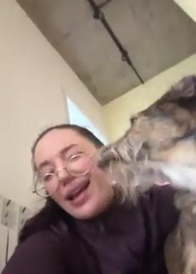 A woman with glasses and a dark purple top is interacting with a small, furry dog. The dog is licking the woman's face while she is holding it. The background includes a cream-colored wall, a white radiator, and a ceiling with exposed pipes. There is also a glimpse of a pink wall to the side. The camera is held close, capturing the interaction between the woman and the dog in detail.