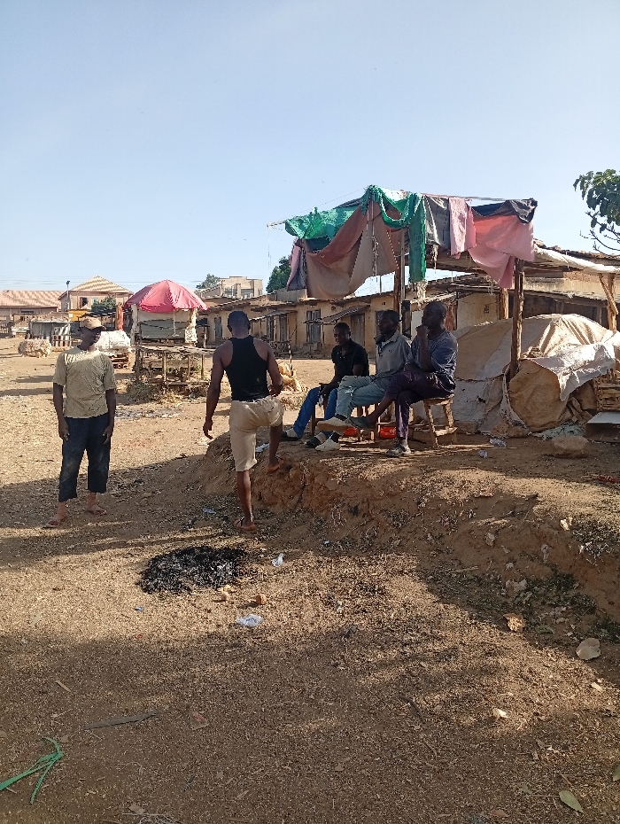 This image captures an open-air scene in an informal market or settlement area within the city of Jos, Nigeria, under a clear, bright blue sky