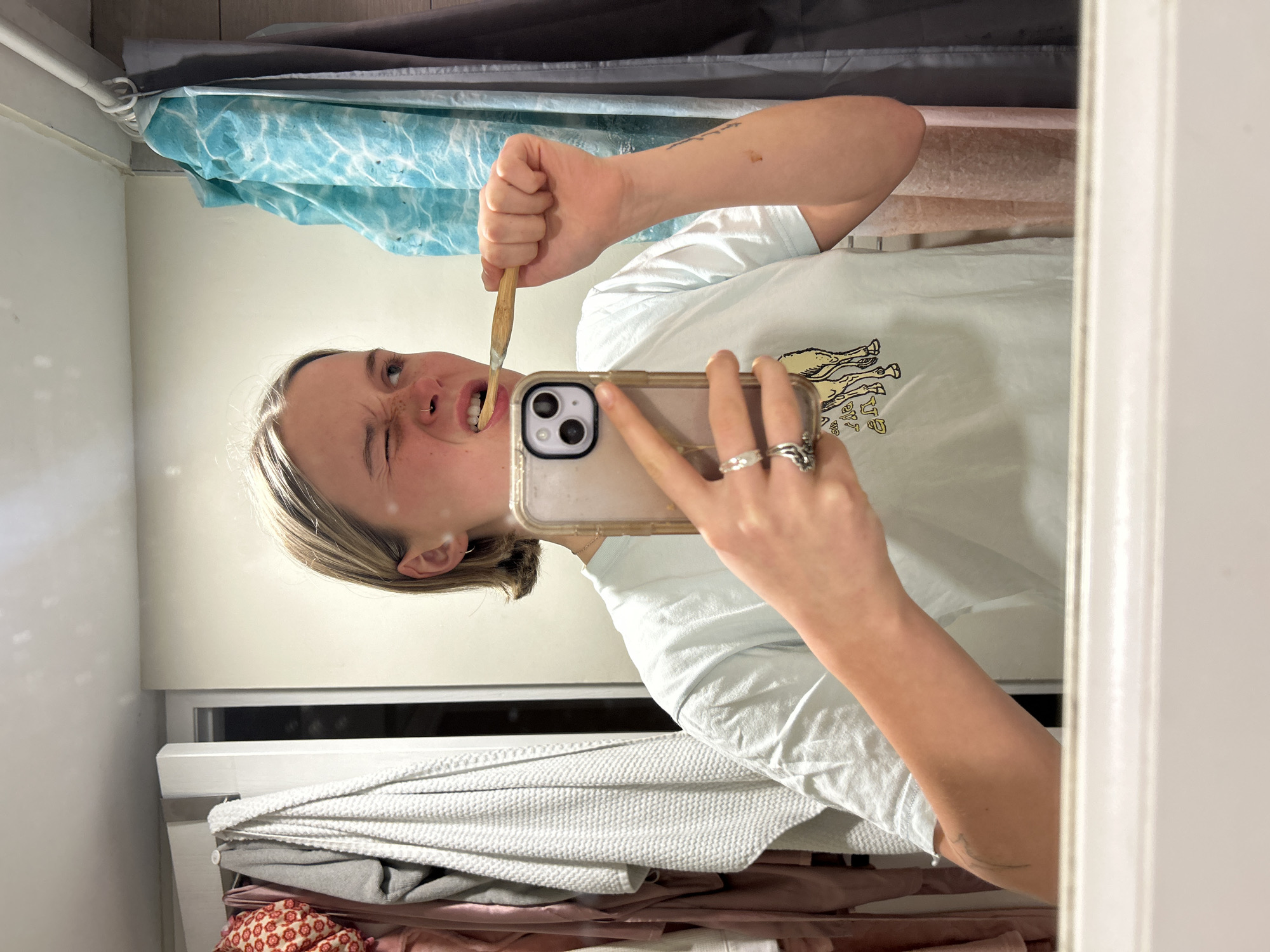 A selfie is being taken in a bathroom mirror, where a person is brushing their teeth with a bamboo toothbrush while holding a smartphone. The person is wearing a light-colored T-shirt with a graphic design. Visible in the background are a shower curtain, a partially visible window or shelf, and folded textiles or clothing. The location is not identifiable as Vancouver, Canada, based on the provided image.