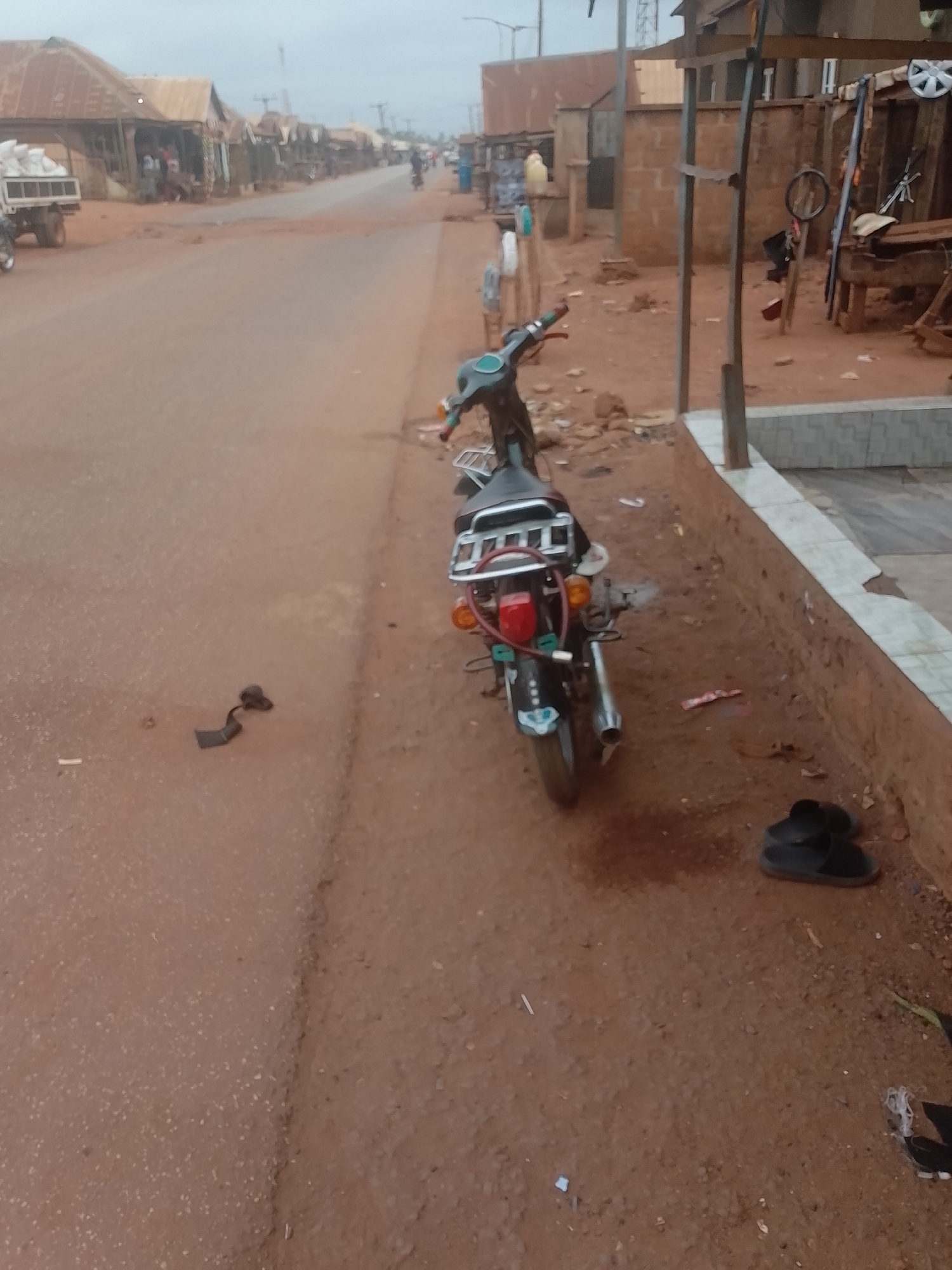 street scene in Ejule, Nigeria. A black motorcycle is parked on the right side of the unpaved road. A pair of black sandals sits near the motorcycle. A dark, broken piece of plastic lies on the road to the left of the motorcycle. The road is mostly empty, and buildings line both sides of the street. In the background, there is a pickup truck, several people, and a dirt road.