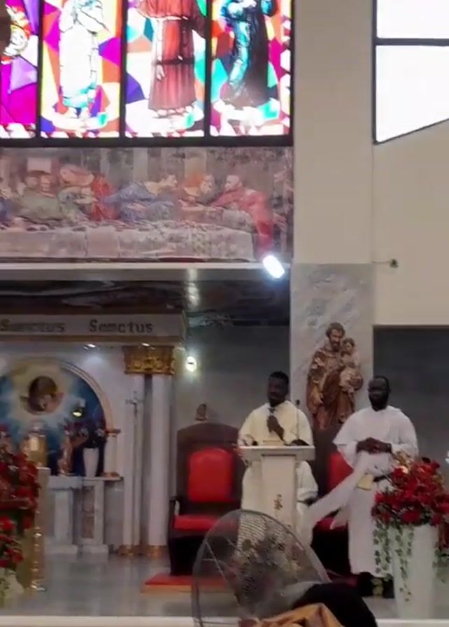 interior of a church, likely during a service. Two priests are visible on a raised platform. One is at a podium, speaking into a microphone. The other stands nearby, holding what appears to be a book or small pad. The church features stained glass windows depicting religious figures and scenes, including the Last Supper. There are decorations of red flowers on the platform, and statues of religious figures are present. A portion of the congregation is visible in the foreground. The overall atmosphere is formal and religious.