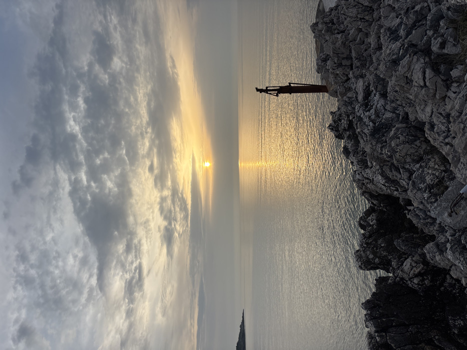 The scene depicts a coastal landscape in Kunje, Montenegro, during either sunrise or sunset. The sun, a prominent golden orb, is positioned low on the horizon, casting a distinct, shimmering path of light across the calm, dark-toned body of water. The sky overhead features a mix of grey and lighter clouds, with a warm, yellowish gradient near the horizon where the sun is located. The immediate foreground is dominated by jagged, dark grey rock formations. On a notable rock outcrop in the mid-right, a rusty, reddish-brown metallic structure, appearing to be a weathered navigational marker or an old mast with angled supports, stands vertically. A distant landmass or headland is faintly visible on the left horizon. No individuals or active subjects are present.