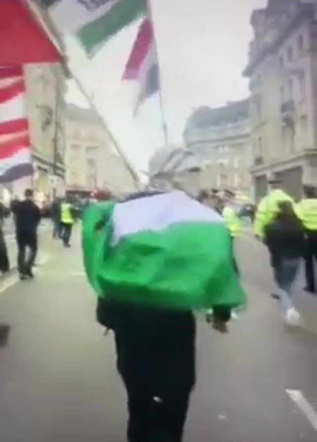 A person carrying a green and white flag with a white head covering walks down a street with a crowd of people. Several people carry flags from countries including Iran, Syria, and Iraq. There are uniformed police officers in bright yellow jackets. The street is lined with buildings on either side, and the day is overcast. The group is moving along a street with painted white lines. The crowd is chanting or shouting.